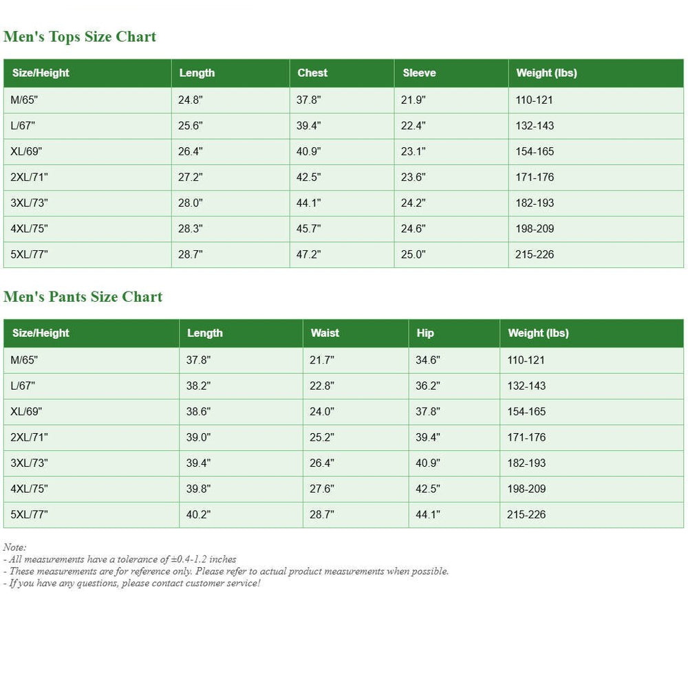 | Size/Height | Length | Chest | Sleeve | Weight (lbs) |